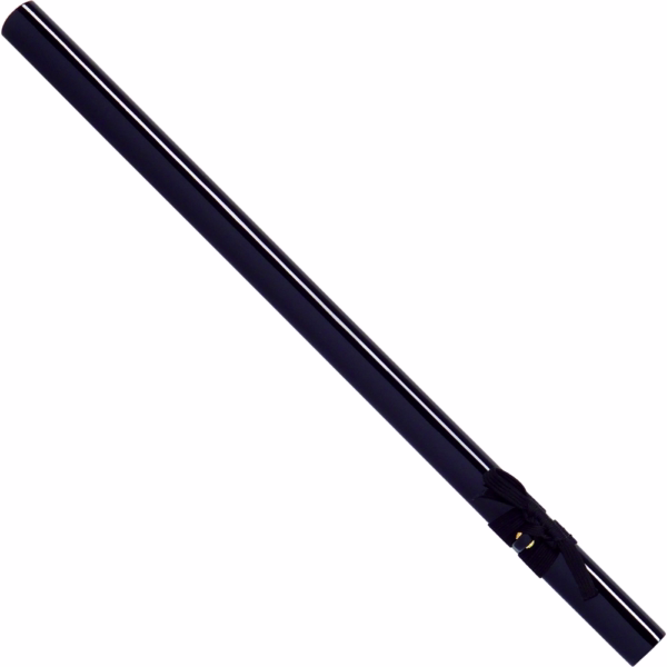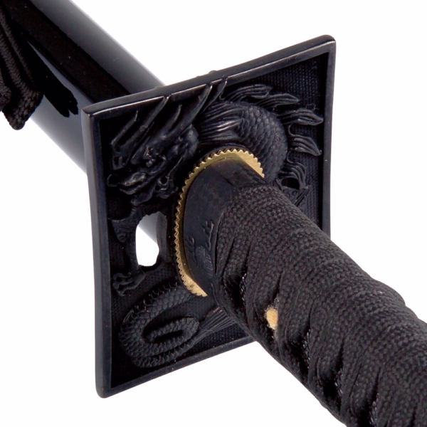 A high qlassic straight NINJA sword with beautifull crafted traditional wide square Tsuba (guard). The forged blade is made od 1045 Carbon Steel is coated black, sharp and has a Bo-hi (groove). Saya (scabbard), is made of wood. Long black Sageo (rope) is attached.