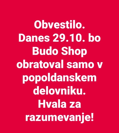 Cenjene stranke obveščamo, da svoja vrata znova odpiramo v PETEK 16.08.Hvala za razumevanje in se priporočamo za obisk!vaš BUDO SHOP team