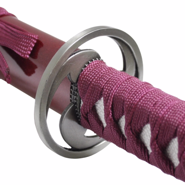 Ta Katana meč ima trden ročaj v klasičnem Hineri Maki ovitjem ročaja z rdečim bombažnim Tsuka-ito in posebno okroglo Tsubo (ščitnik). Saya (nožnica) v rdeči barvi s Kamon potiskom na dnu, je narejena iz lesa in laminirana, kar omogoča nešteto izvlekov in vračanj meča, brez znatne obrabe ali zloma.