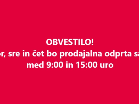 Cenjene stranke obveščamo, da bo prodajalna v torek, sredo in četrtek (18.-20.11.2025) odprta samo med 9:00 in 15:00 uro.